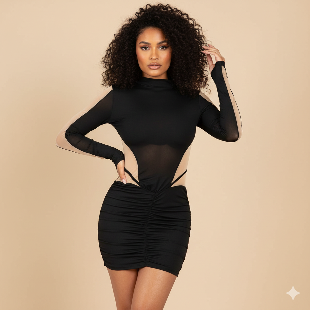 The elegant long sleeves and sophisticated high neck are perfectly contrasted by the bold mesh cutouts, which offer a modern, alluring style. The ruched mini skirt adds a flattering texture, ensuring a comfortable and perfect fit. This dress is a must-have for a night out, cocktail parties, or any special occasion where you want to stand out. When you want to buy trendy dresses online, this piece delivers on both style and impact.