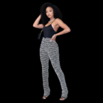 Make a bold statement with the Zelia Textured Striped Stacked Pants, a true showstopper now available at the Lunathi online store. This trendy and unique piece is a must-have for any fashion-forward woman across South Africa looking to elevate her style. These high-waisted pants feature a striking black and white horizontal stripe pattern and a one-of-a-kind textured knit fabric that is both comfortable and chic.